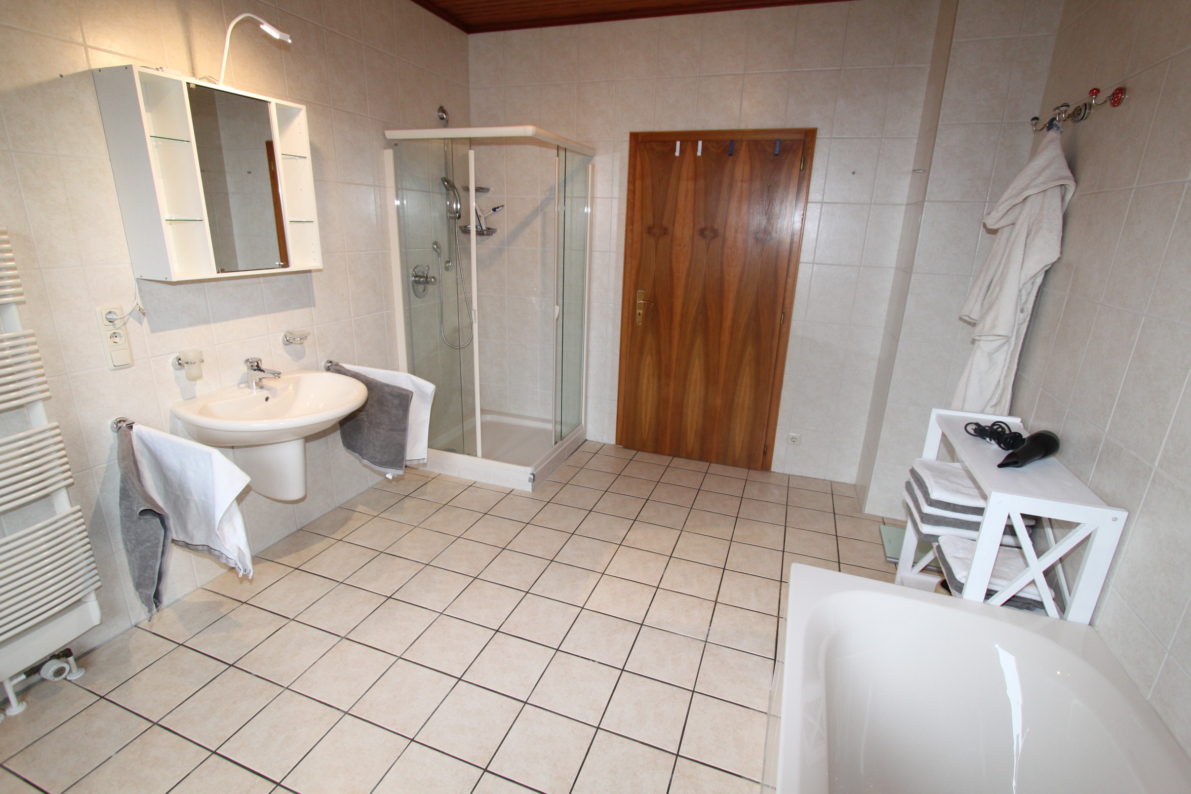 Das Badezimmer ist sehr groß und verfügt über eine Badewanne, Dusche sowie einen Föhn. Ein Spiegelschrank und ein Standregal bieten genug Möglichkeiten zum Abstellen Ihrer Hygieneartikel.