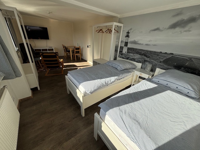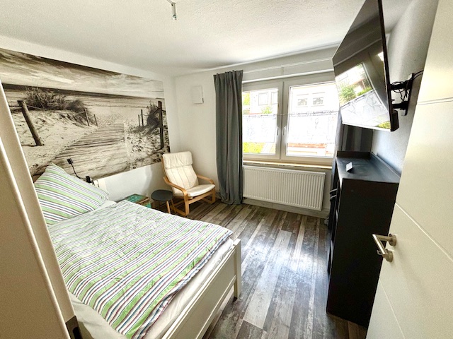 Über eine Holztreppe kommen Sie in das Obergeschoss und erhalten Zugang zu den Schlafzimmern mit jeweils 2 Einzelbetten mit einer Falttür verbunden. Das 1. Schlafzimmer verfügt zur Straßenseite ebenfalls über eine 3-fach Verglasung und ist damit herrlich ruhig un mit einem Fernseher ausgestattet. Das 2. Schlafzimmer beinhaltet 2 Einzelbetten und ein Babybett. Es befindet sich im Treppenhaus diverses Spielzeug welches für Kinder unter 3 Jahren nicht geeignet ist. Dies ist nur unter Aufsicht zu benutzen.